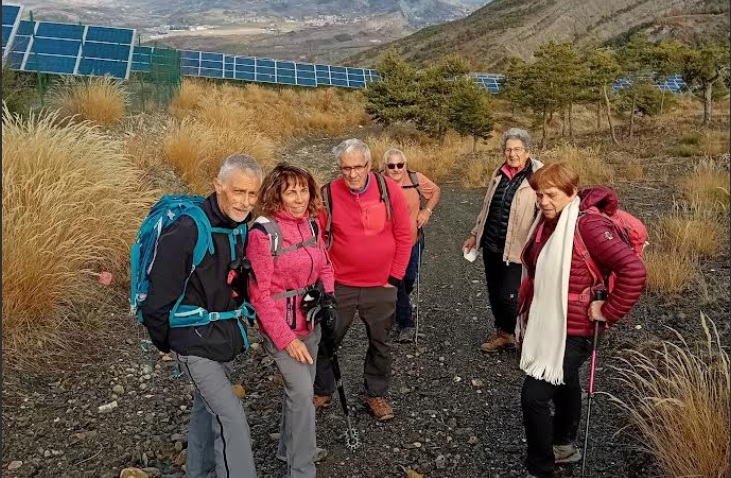 Sur un joli sentier forestier (boueux et glissant), nous gravissons, Par les touées dans la forêt, on découvre : la vallée de la Durance, le pic de Crigne, Ceüze, Tallard, Gap, Bure etc… Au point culminant (985m), nous découvrons d’immenses champs de panneaux photovoltaïques (42 ha, 100 000 panneaux, 33 000 000 kw/h : la consommation de 10 500 foyers !!!). Tout près le monument aux maquisards fusillés en 1944. De bons gros rochers tout ronds (témoins de rabotage d’un glacier) nous invitent à nous asseoir pour casse-croûter. Très vite, nous quittons la superbe route, très pentue, dédiée à l’entretien. Par la forêt on arrive au hameau de la Curnerie (bien à l’ombre à l’ubac). Sous un soleil voilé les voitures nous attendent … Merci Nicole !
